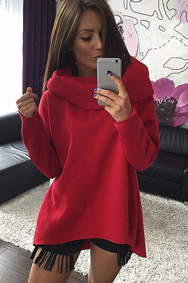 Стильная флисовая толстовка красного цвета. Модель имеет асимметричный подол и объемный ворот-хомут.
